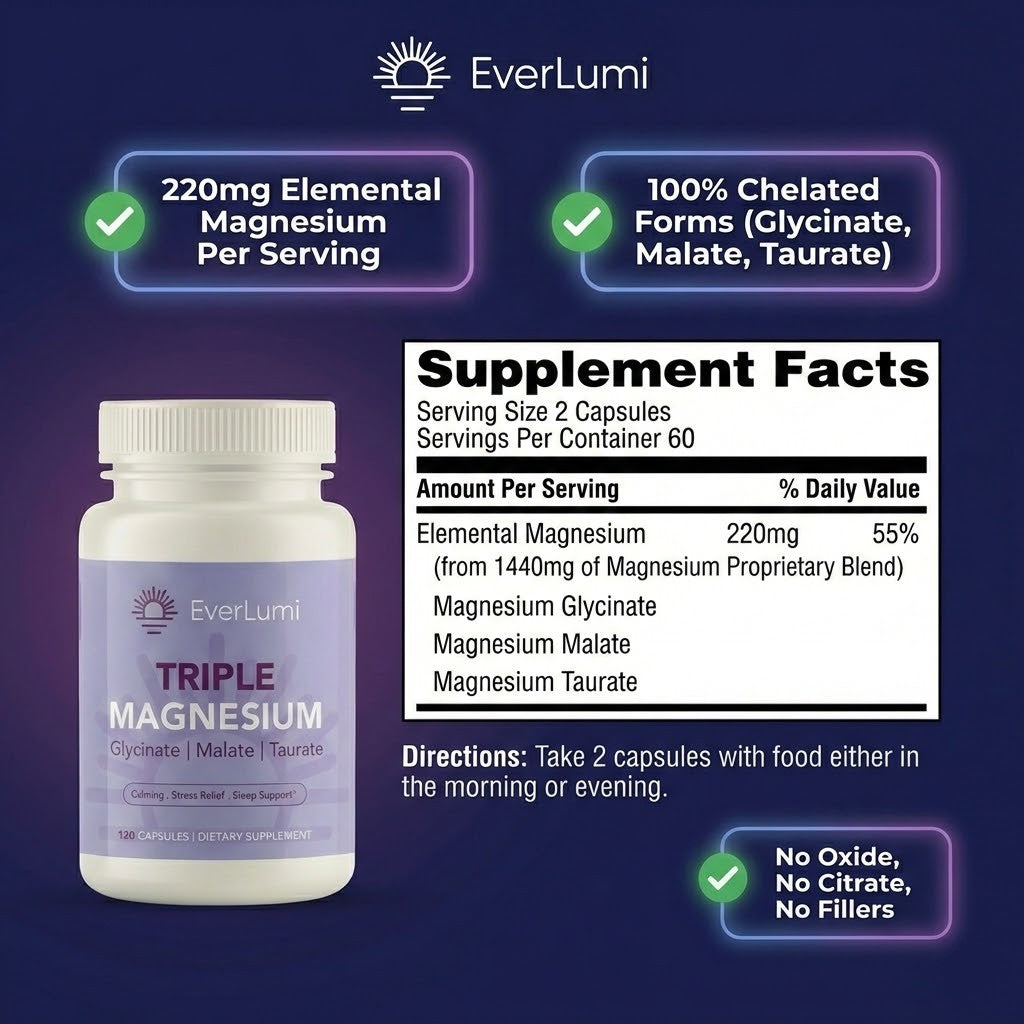 Experience optimal absorption with EverLumi Triple Magnesium Complex—a premium, 3-in-1 formula designed to provide a full 60 days of high-potency support. While standard supplements rely on a single, hard-to-absorb source, EverLumi combines three 100% chelated forms to ensure your body actually utilizes every milligram.